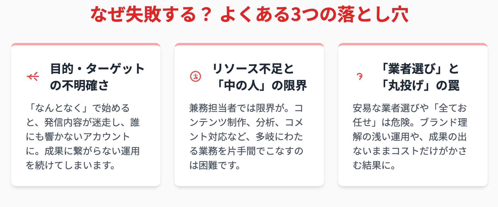 運用代行業者選びの失敗は、Instagram運用戦略における致命的なエラーとなり得るため、極めて慎重な判断が求められます。