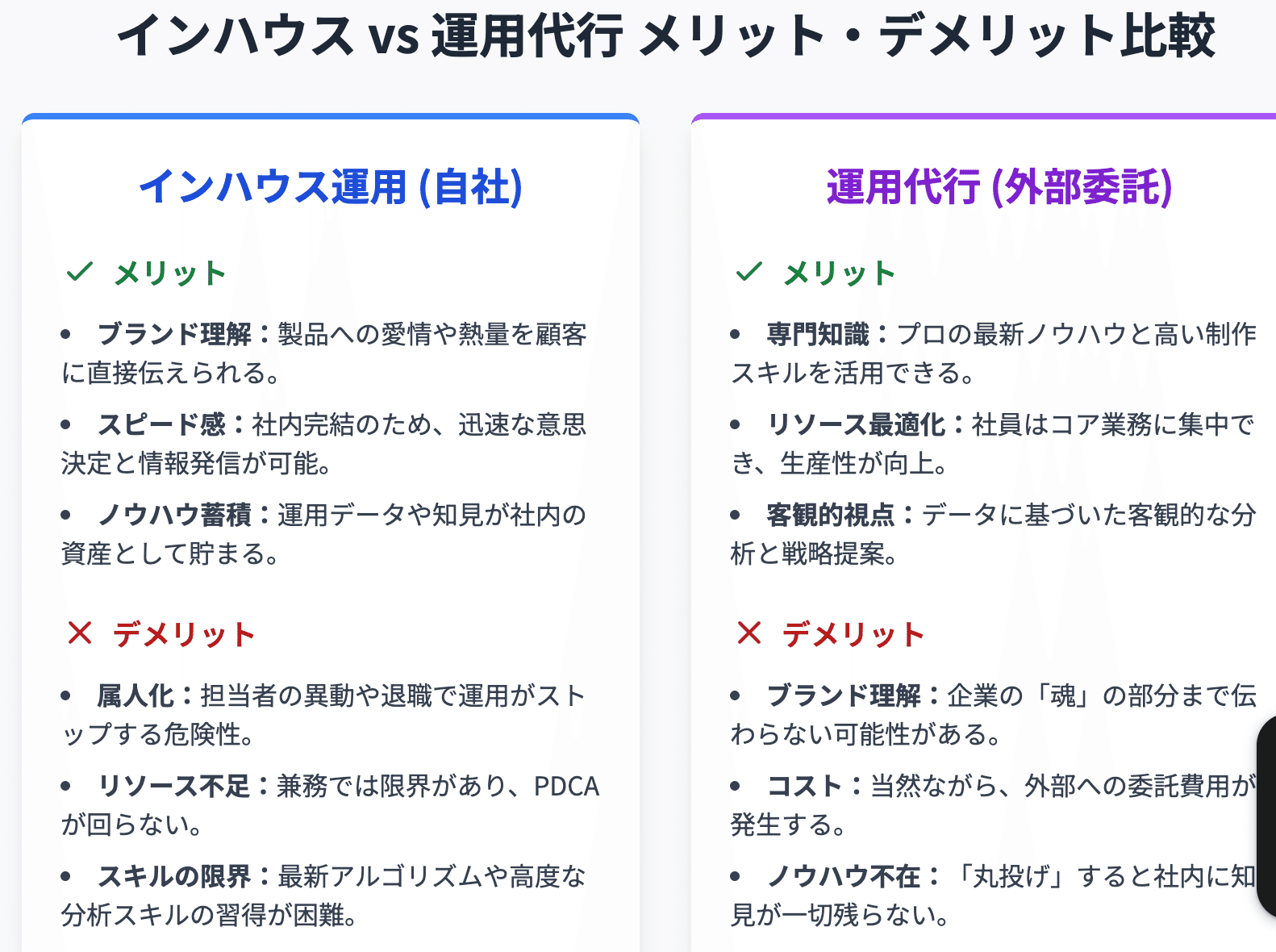 次に、インハウス運用(自社運用)と運用代行(外部委託)、それぞれのメリット・デメリットを多角的に比較しました。