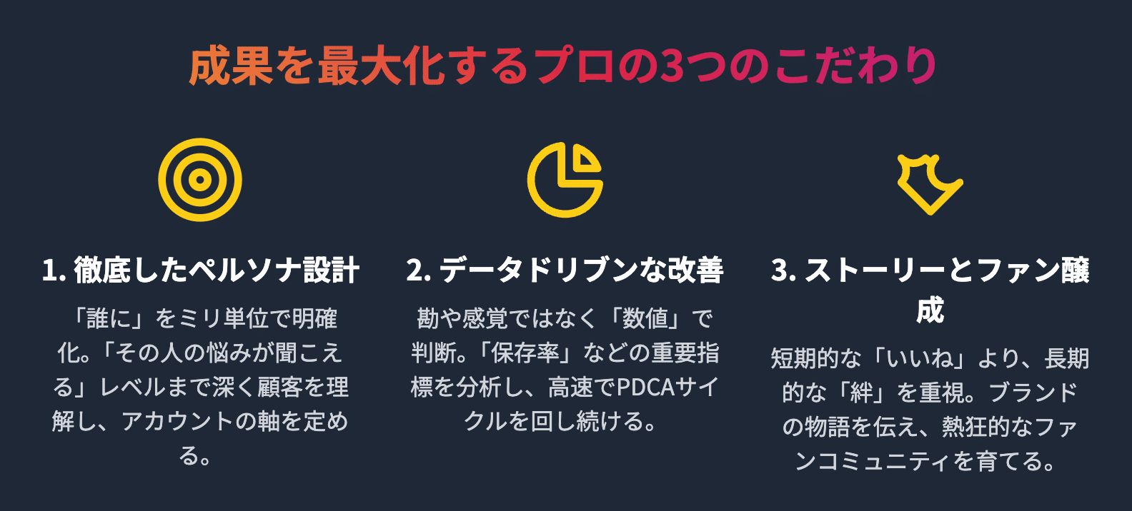 - 全ての土台となる、徹底した「アカウント設計」と「ペルソナ設定」。
