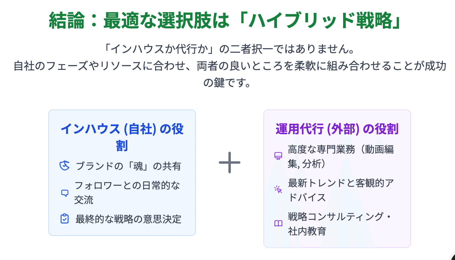 最後に、二者択一ではなく、自社のフェーズに合わせて柔軟に組み合わせる**「ハイブリッド戦略」**こそが、現実的かつ効果的な選択肢となり得ることをご紹介しました。