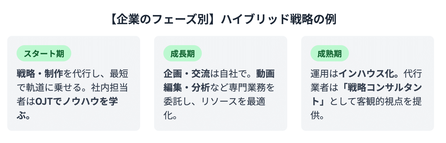 ハイブリッド型運用とは、企業の現在のフェーズ(段階)や利用可能なリソース、達成したい目標に応じて、インハウス運用と運用代行の業務範囲を柔軟に組み合わせるアプローチです。