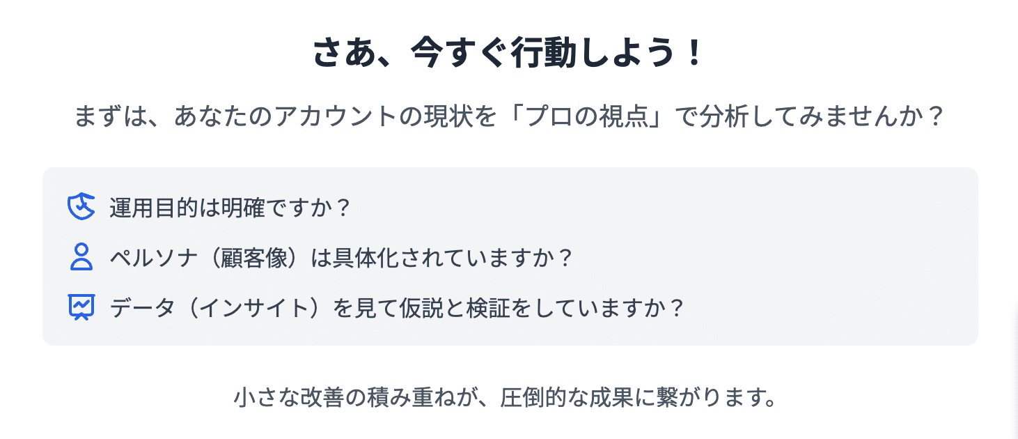 これにより、最短距離でアカウントの土台を構築しつつ、将来的なインハウス化に向けた社内教育も同時に進めることができます。