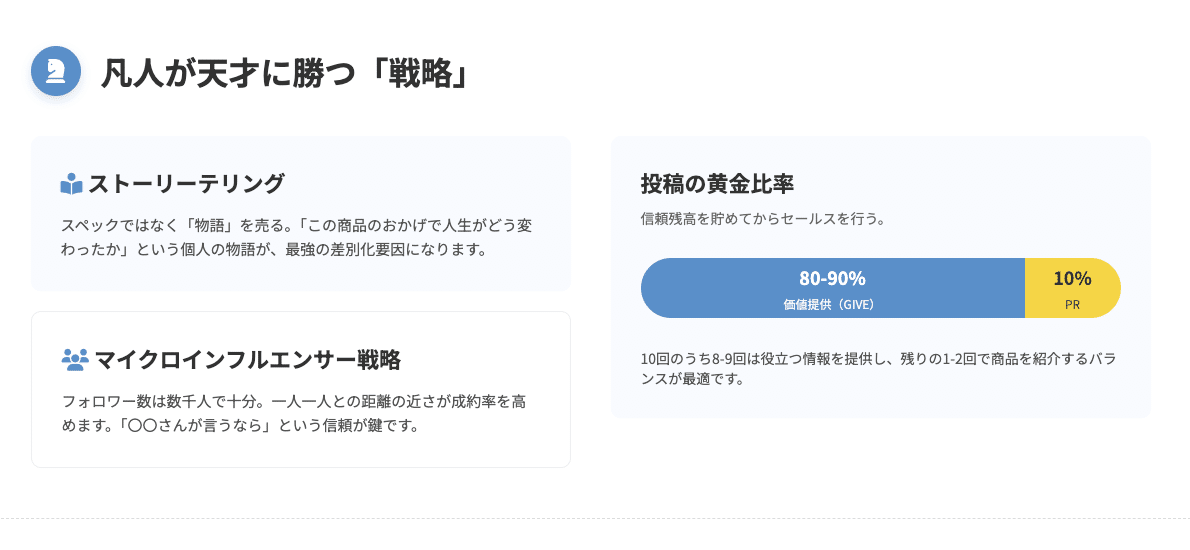 つまり、10回の投稿のうち、8回から9回は、フォロワーにとって純粋に価値のある情報を提供し、残りの1回か2回で、満を持して商品を紹介する、というバランスです。