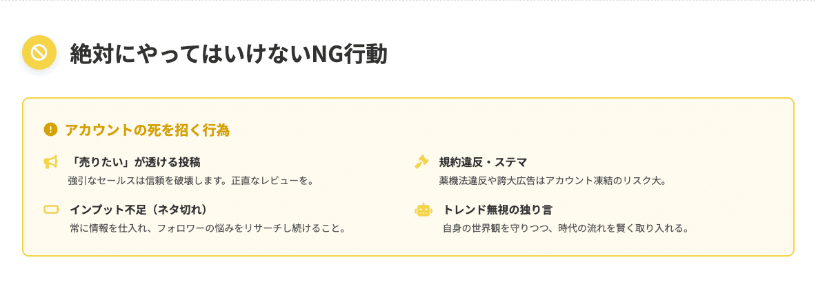 これまで、コツコツと時間をかけて育ててきた大切なアカウントが、たった一度の過ちで、全て水の泡となってしまうのです。