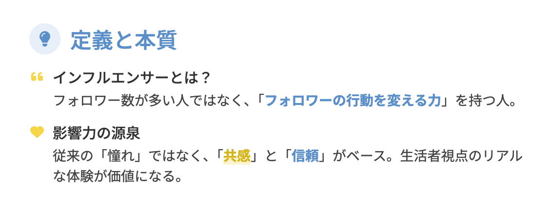 従来のメディアスターが「憧れ」の対象であったのに対し、SNS時代のインフルエンサーは、「共感」と「信頼」をベースにした身近な存在であることが最大の特徴です。