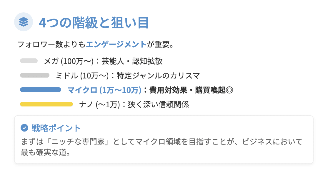 そして、私が最も注目し、これから参入する皆さんに目指してほしいのが、フォロワー数1万人から10万人の「マイクロインフルエンサー」という領域です。