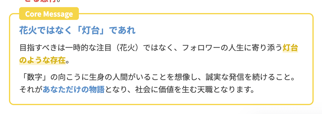 私たちが目指すべきは、一時的に注目を集めて消えていく花火のような存在ではなく、フォロワーの人生に寄り添い続ける灯台のような存在です。