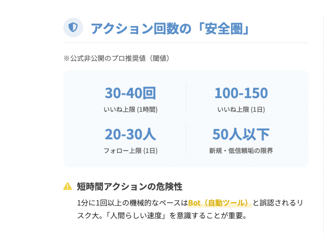 しかし、私たちのようなスクール運営者やプロのマーケターは、数多くのアカウントデータを分析することで、**安全圏とされる「閾値(しきいち)」**を把握しています。
