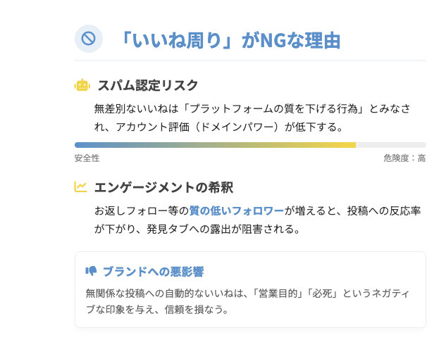 過去には1日数百回のいいね周りを推奨するノウハウもありましたが、現在はアルゴリズムの検知能力が飛躍的に向上しており、過剰なアクションは百害あって一利なしです。
