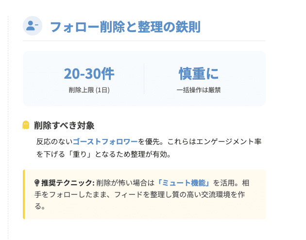 無理にフォロー解除を繰り返してアカウントを危険に晒すよりも、ミュート機能を使いこなして快適な運用環境を作る方が、精神的にもアルゴリズム的にも健全です。