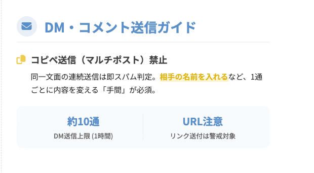 DMの送信上限についても、公式発表はありませんが、1時間あたり10通前後に留めておくのが安全圏です。