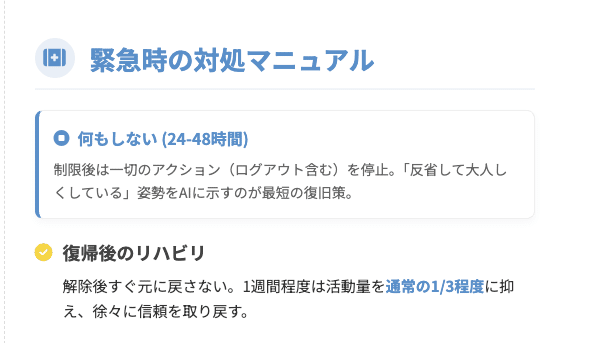 ここでは、制限がかかってしまった直後に取るべき、正しい対処ステップと復旧までの過ごし方を具体的にお伝えします。