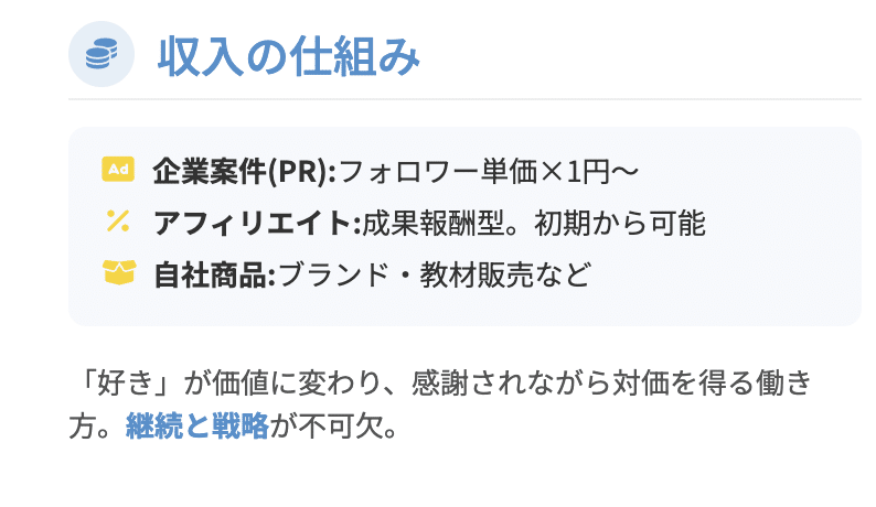 これはフォロワー数に関係なく始められるため、初期の段階から収益化を目指せる重要な手段となります。