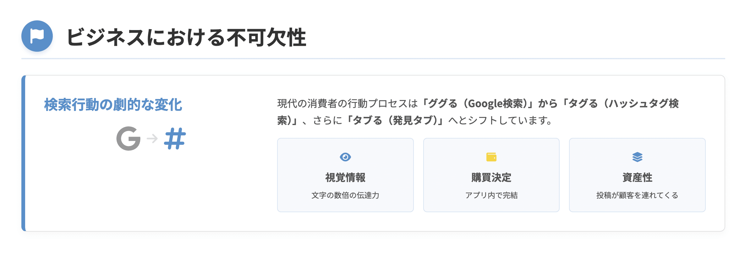 なぜなら、消費者の行動プロセスが「ググる(Google検索)」から「タグる(ハッシュタグ検索)」、さらには「タブる(発見タブでの受動的発見)」へと大きくシフトしているからです。
