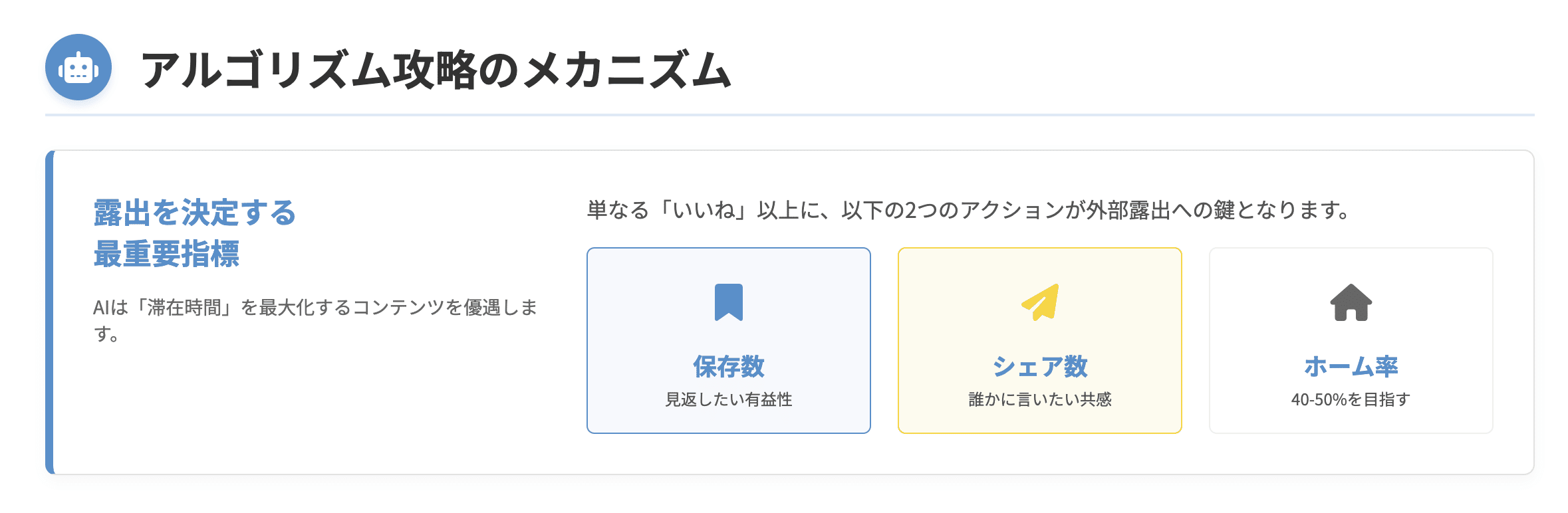 特に近年重要視されているのが、ユーザーが「後で見返したい」と感じたことを示す「保存数」と、第三者に教えたい心理が働く「シェア数」の2つです。