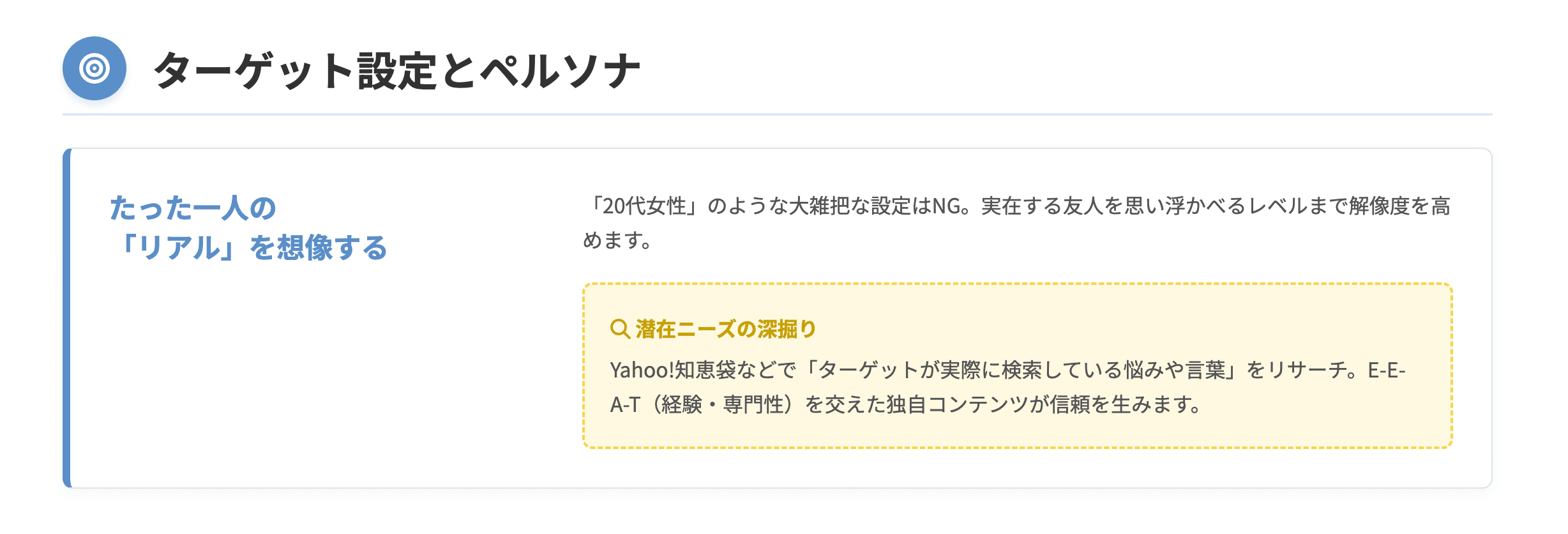 ペルソナを設定する際は、実在する友人を一人思い浮かべるレベルまで、解像度を極限まで高める必要があります。