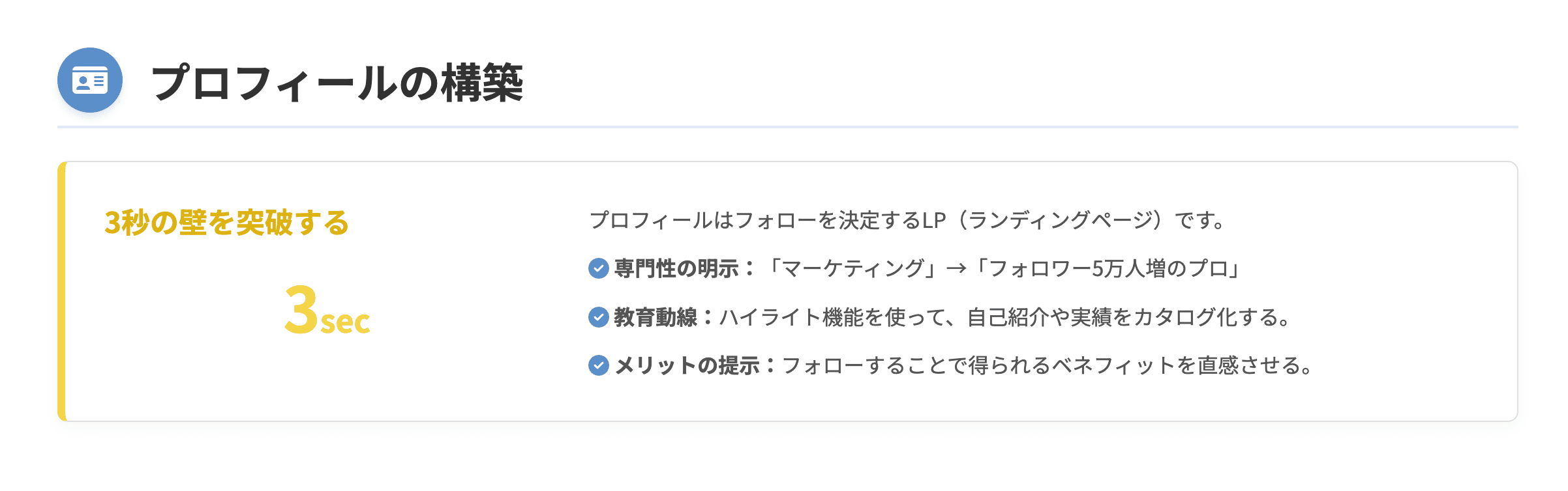 アカウントを訪れたユーザーは、平均して3秒以内に「このアカウントは自分にとって有益か」をジャッジすると言われています。