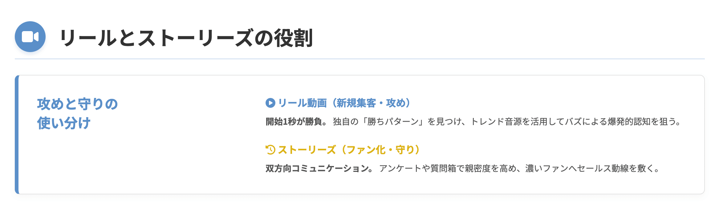 フィードやリールが「新規集客(攻め)」の役割を担うなら、ストーリーズは「既存フォロワーの教育(守り・深耕)」を担う重要な機能です。