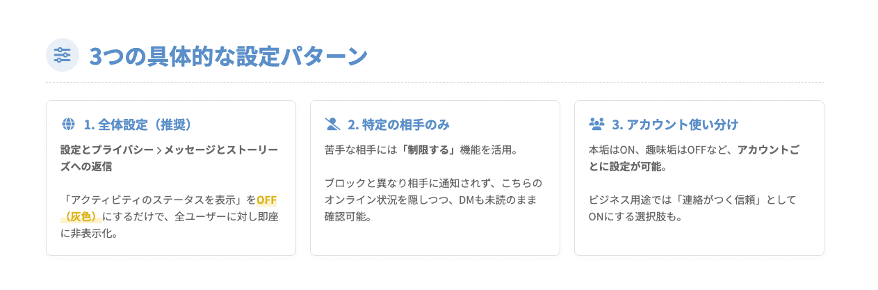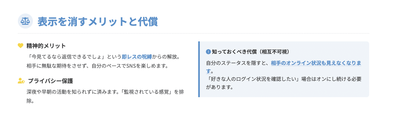 さらに、単なる設定変更だけでなく、特定の相手だけに見せない高度なテクニックや、逆に自分がオンラインであることを隠すメリット・デメリットまでを網羅しました。