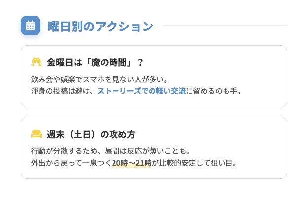 毎日同じ時間に機械的に投稿するのではなく、曜日の特性に合わせた戦略が必要です。