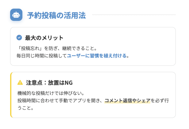 - 予約投稿を活用しつつ、投稿後のコミュニケーションは必ず手動で行う。