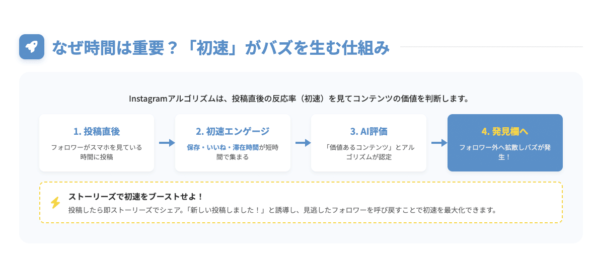 それは、Instagramのアルゴリズムにおいて「初速」が極めて重要だからです。