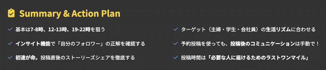 多くのインフルエンサーや企業アカウントもこの時間を狙うため、競合が非常に多く、投稿が埋もれやすいというデメリットも併せ持っています。