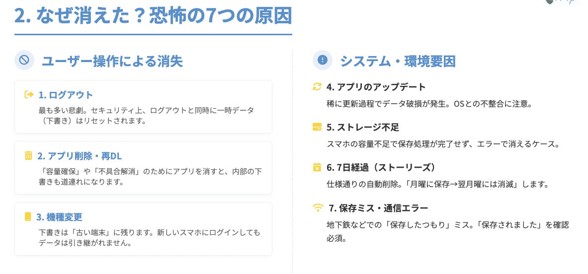 ここからは、多くのユーザーを悩ませる**「下書きが勝手に消えた」という現象の真犯人を突き止めます**。