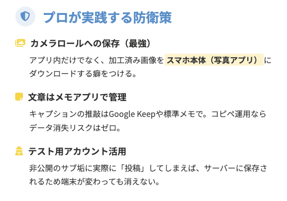 ストーリーズの下書きは「短期記憶」だと割り切り、長期保存したい素材は必ずカメラロールに保存してください。