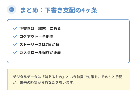 ストーリーズの下書きはあくまで「一時的な退避場所」であり、長期保存には向かないことを肝に銘じておきましょう。