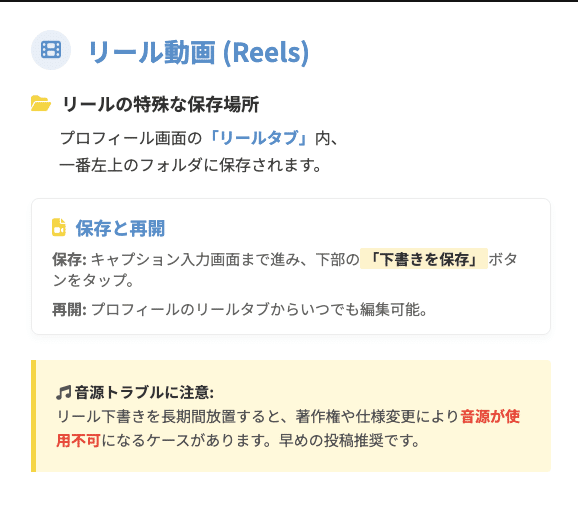 リールは音源の著作権や仕様変更の影響を受けやすいため、長期間放置すると音源が使えなくなるケースもあるので注意が必要です。