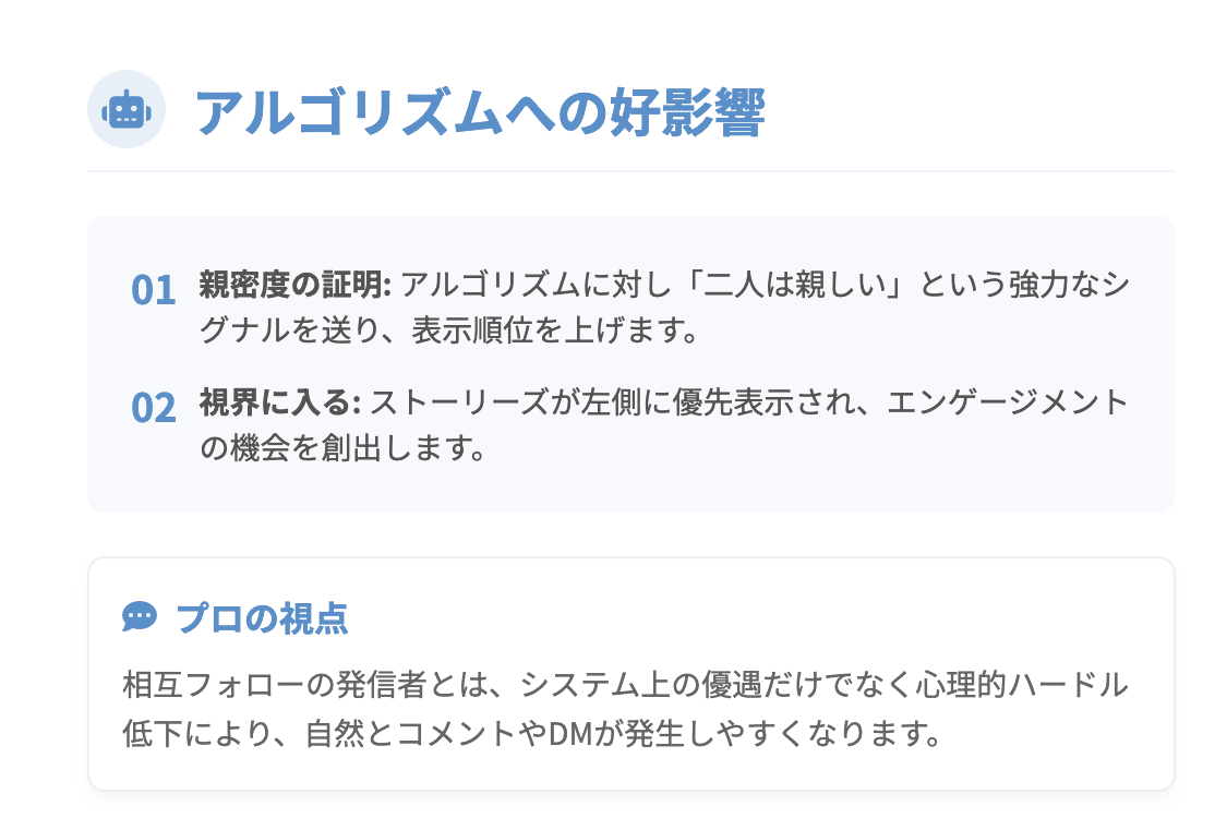 相互フォローであるという事実は、アルゴリズムに対して「この二人は親しい関係である」という強力なシグナルを送ります。