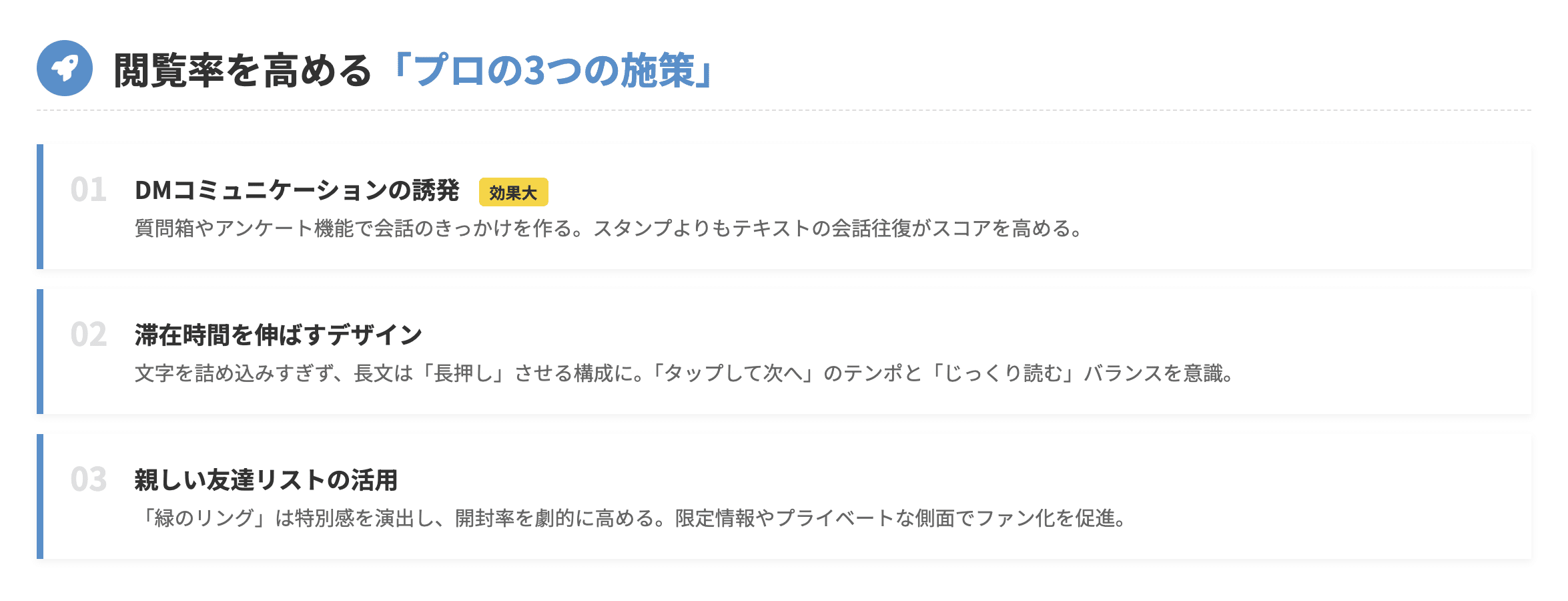 また、長文を書く場合はあえて「長押しして読む」ような構成にするのも一つのテクニックと言えます。