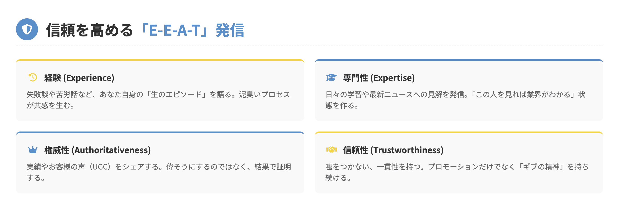 ここで**E-E-A-T(経験、専門性、権威性、信頼性)**を意識した発信をすることで、ファン化が加速します。