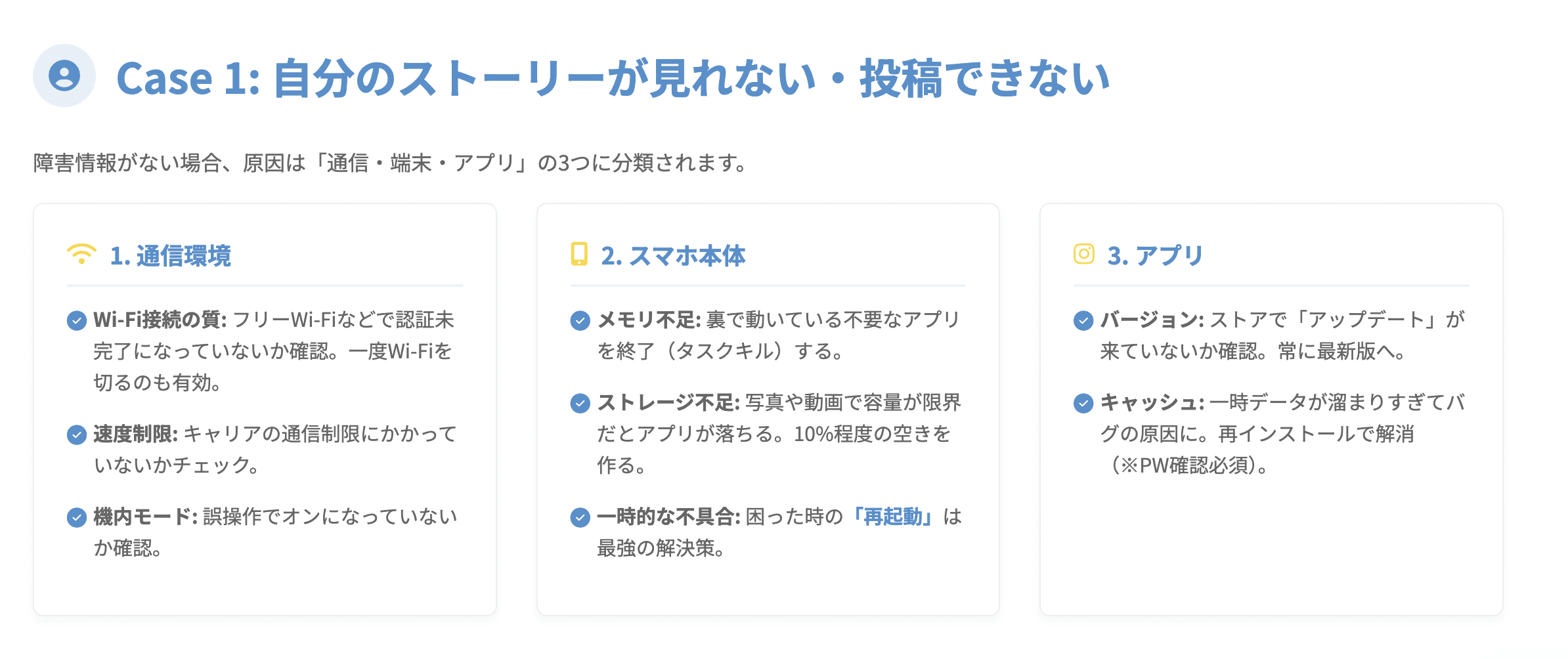 原因は大きく分けて「通信環境」「スマートフォン本体」「インスタグラムアプリ」の3つに分類され、これらを順に潰していくことが解決への近道です。