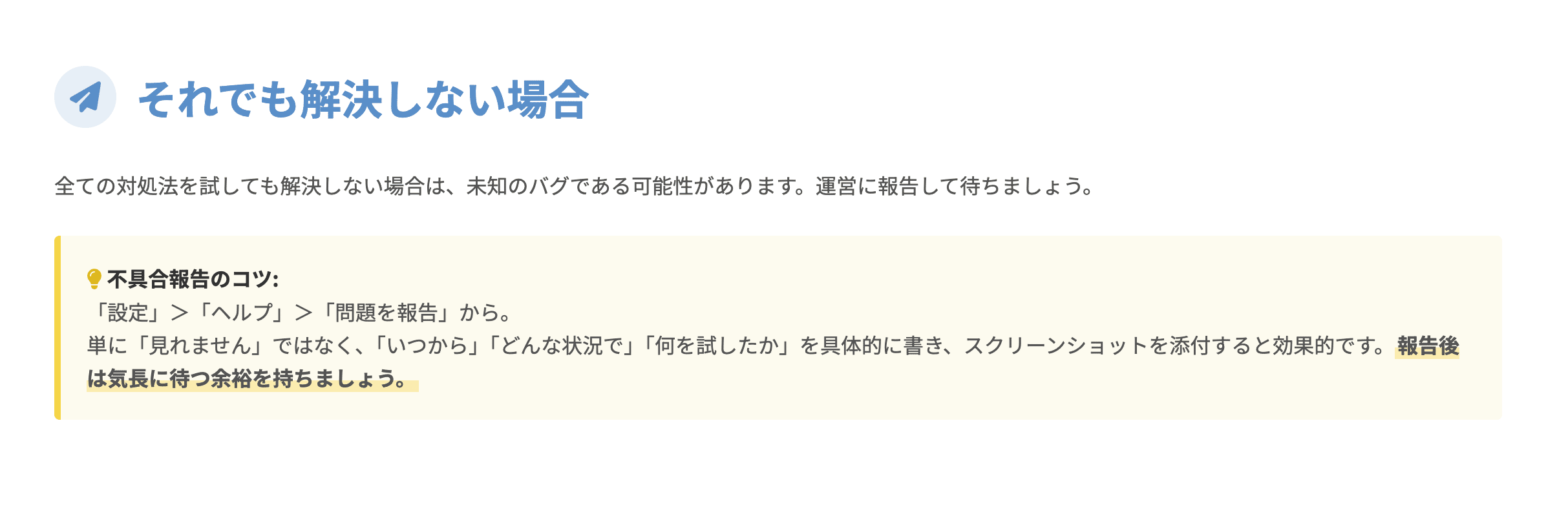 不具合報告をしたからといって、魔法のように即座に直るわけではありません。