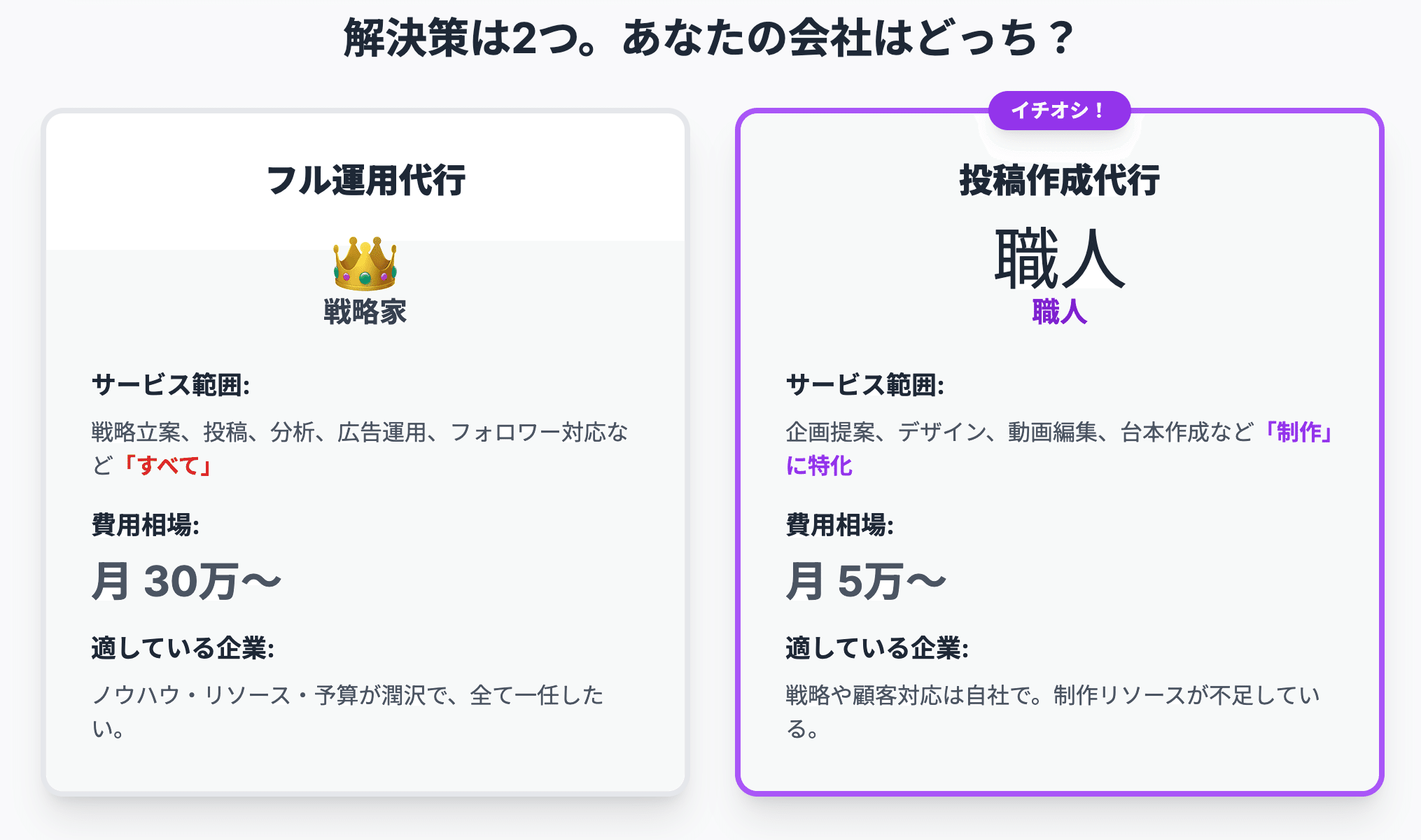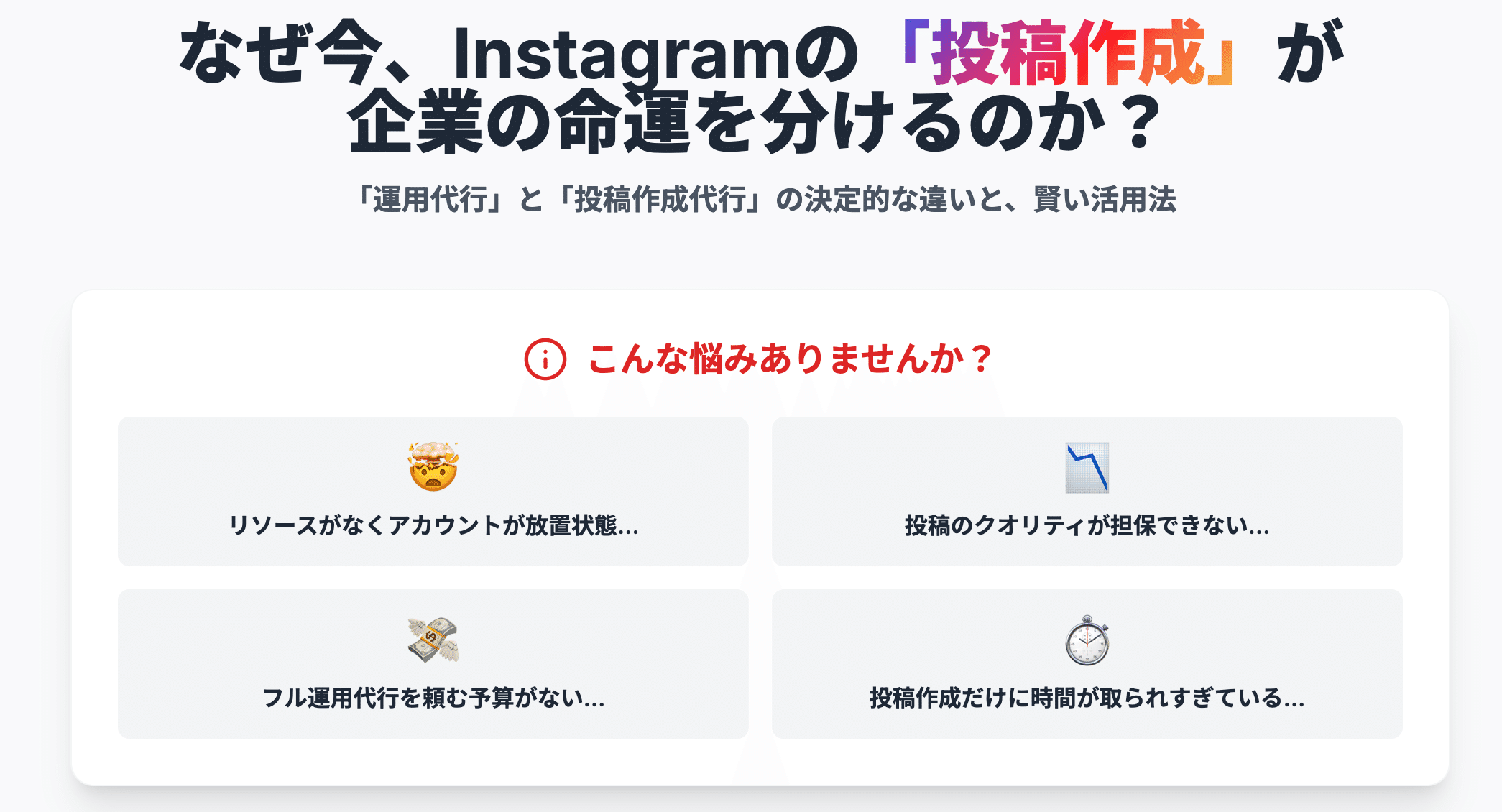 さらに深刻なのは、「本格的な運用代行サービスに依頼するほどの予算は確保できないが、日々の投稿作成だけでもプロフェッショナルの力を借りたい」という、切実な声でしょう。