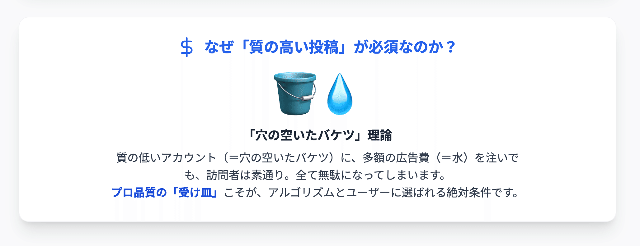 フォロワーの継続的な獲得、そして将来的な顧客へと育成していくためには、盤石な「受け皿」、すなわち質の高いコンテンツが不可欠なのです。