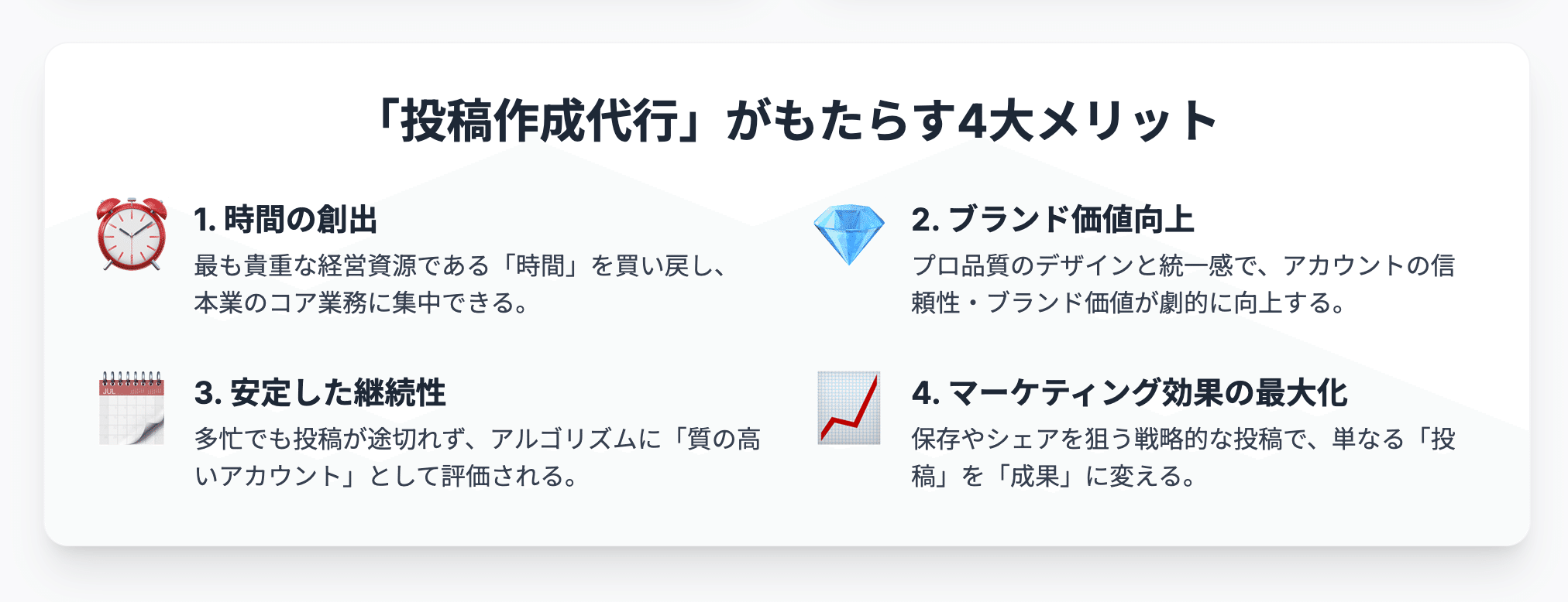 Instagram投稿作成代行サービスを利用することは、単に**「作業を外注できる」**というレベルの話にとどまりません。
