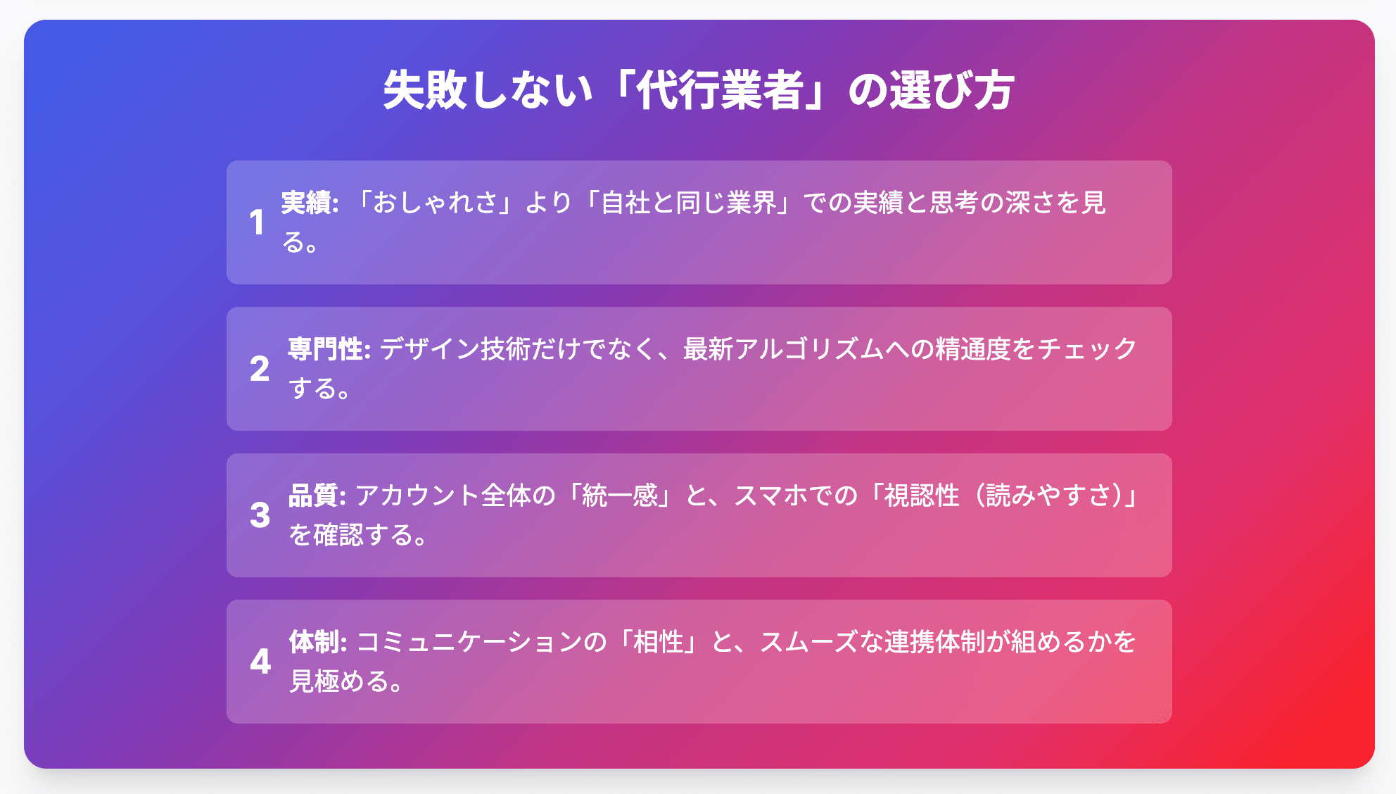 数多くの代行業者と協働・競合してきた私のプロフェッショナルな視点から、絶対に失敗しないための**「選定基準」**を、4つの重要なポイントに絞って伝授します。