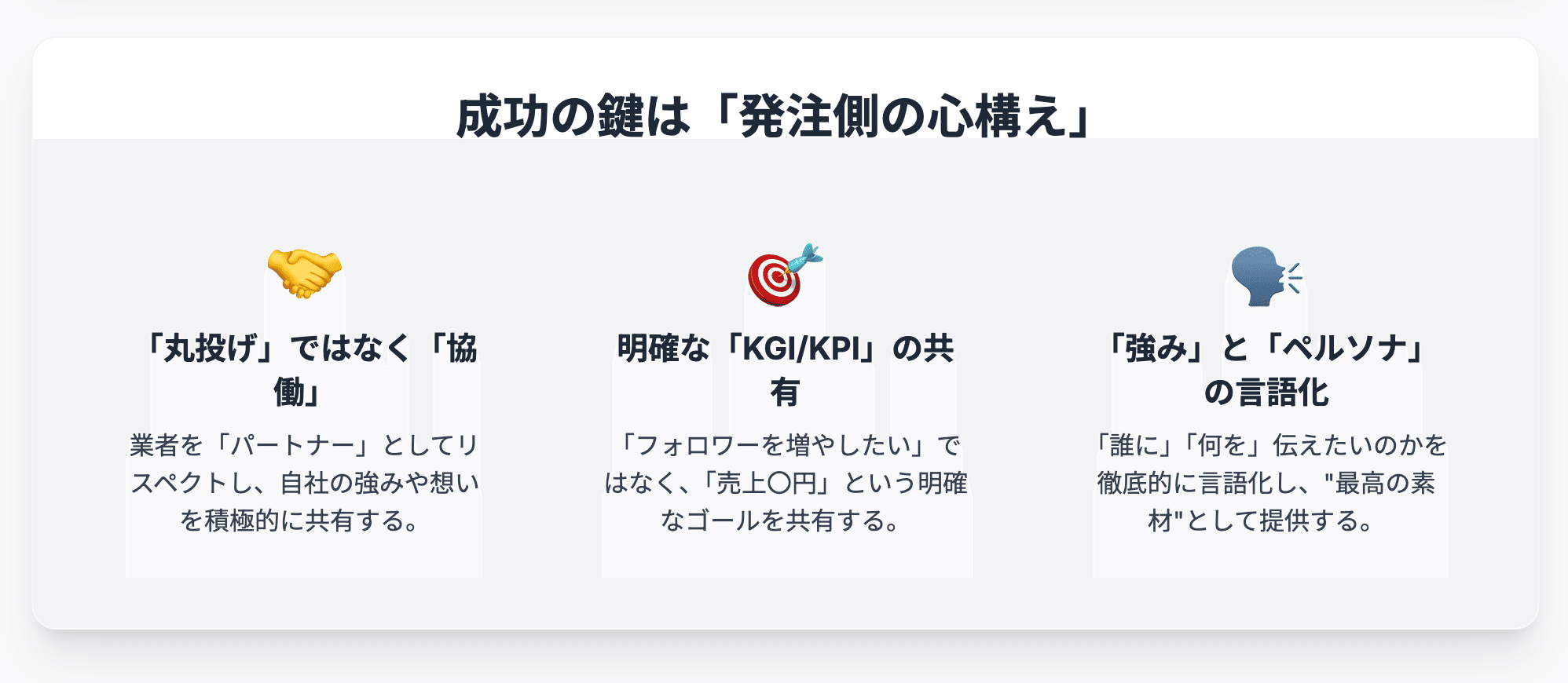 最後に、投稿作成代行を**「失敗」ではなく「大成功」に導くために、発注側が持つべき三つの重要な心構え**についてお話しします。