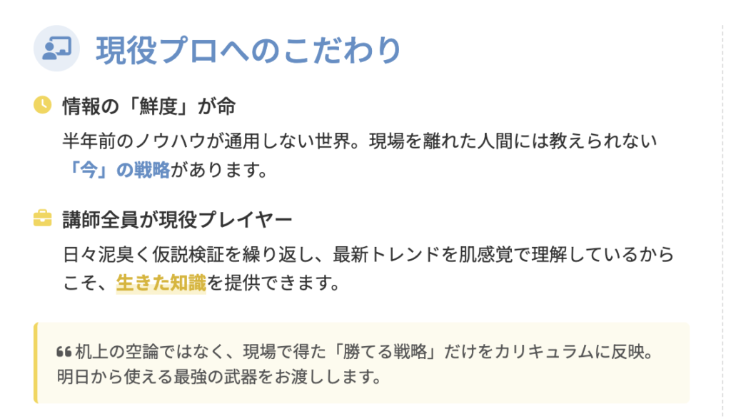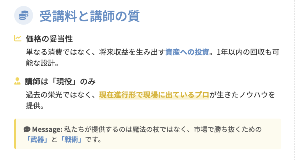 机上の空論ではなく、現場で得た「勝てる戦略」だけをカリキュラムに反映させています。