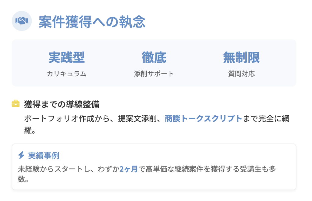 そのために、ポートフォリオの作成から提案文の添削、商談時の具体的なトークスクリプトまで完全に網羅しています。