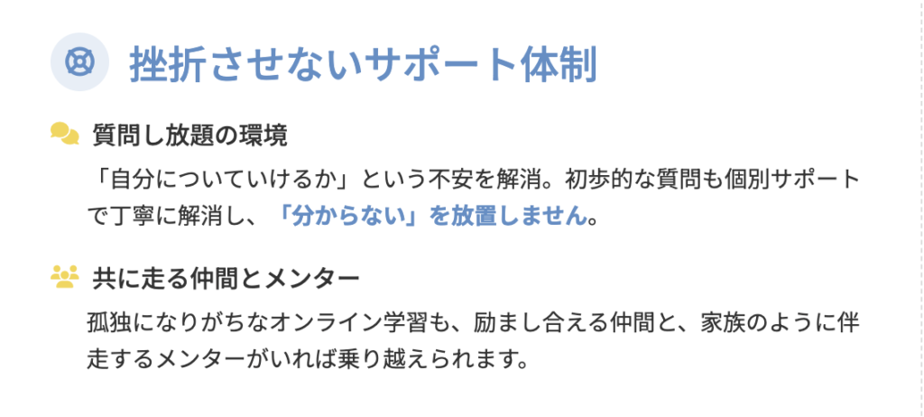 グループチャットで聞きにくい初歩的な質問も、個別サポートで丁寧に解消できるため、安心して学習を進められます。