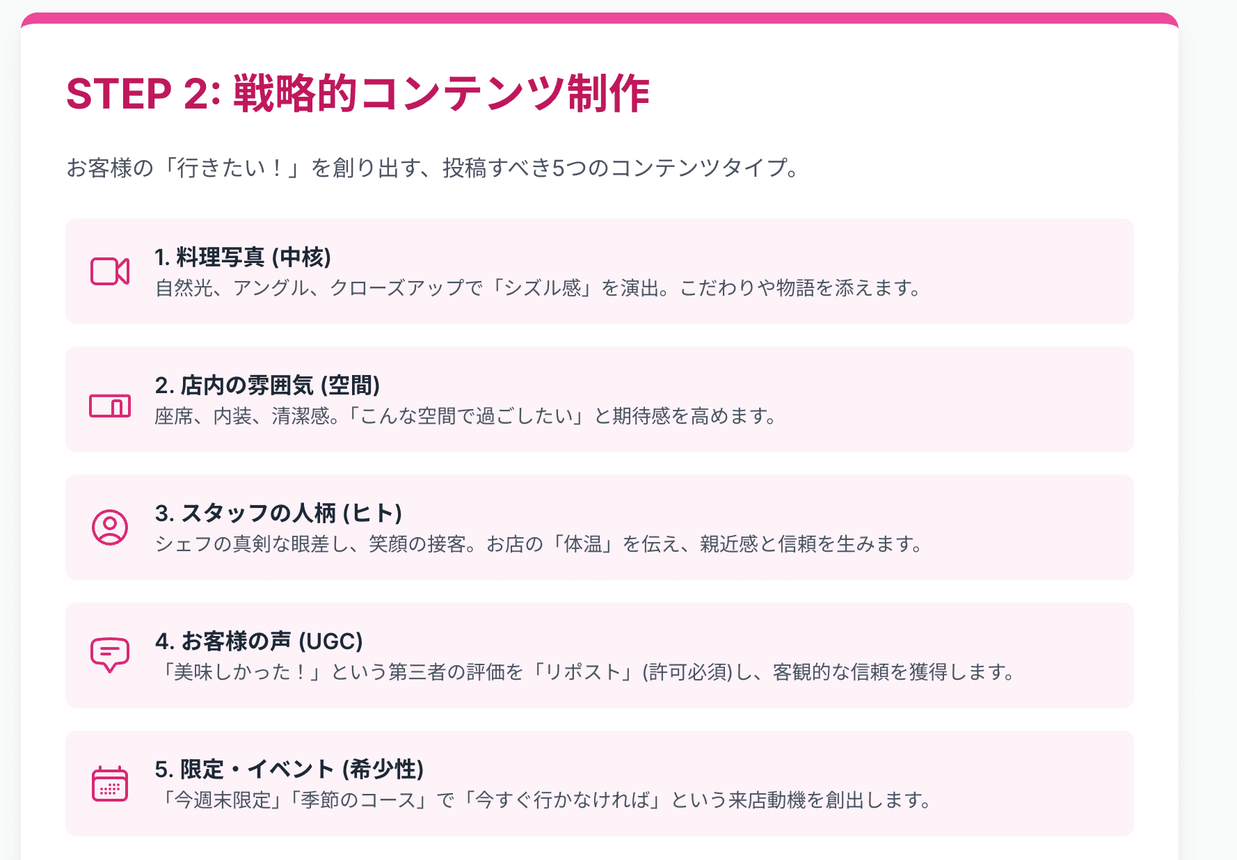 このペルソナに向けて発信すべきは、安さやボリューム感をアピールする投稿ではなく、シェフが厳選した旬の食材の紹介、こだわりの調理法、ワインとのペアリングの提案、そして記念日プレートの美しい写真といった「質の高さ」や「特別感」を伝えるコンテンツであることは明らかです。