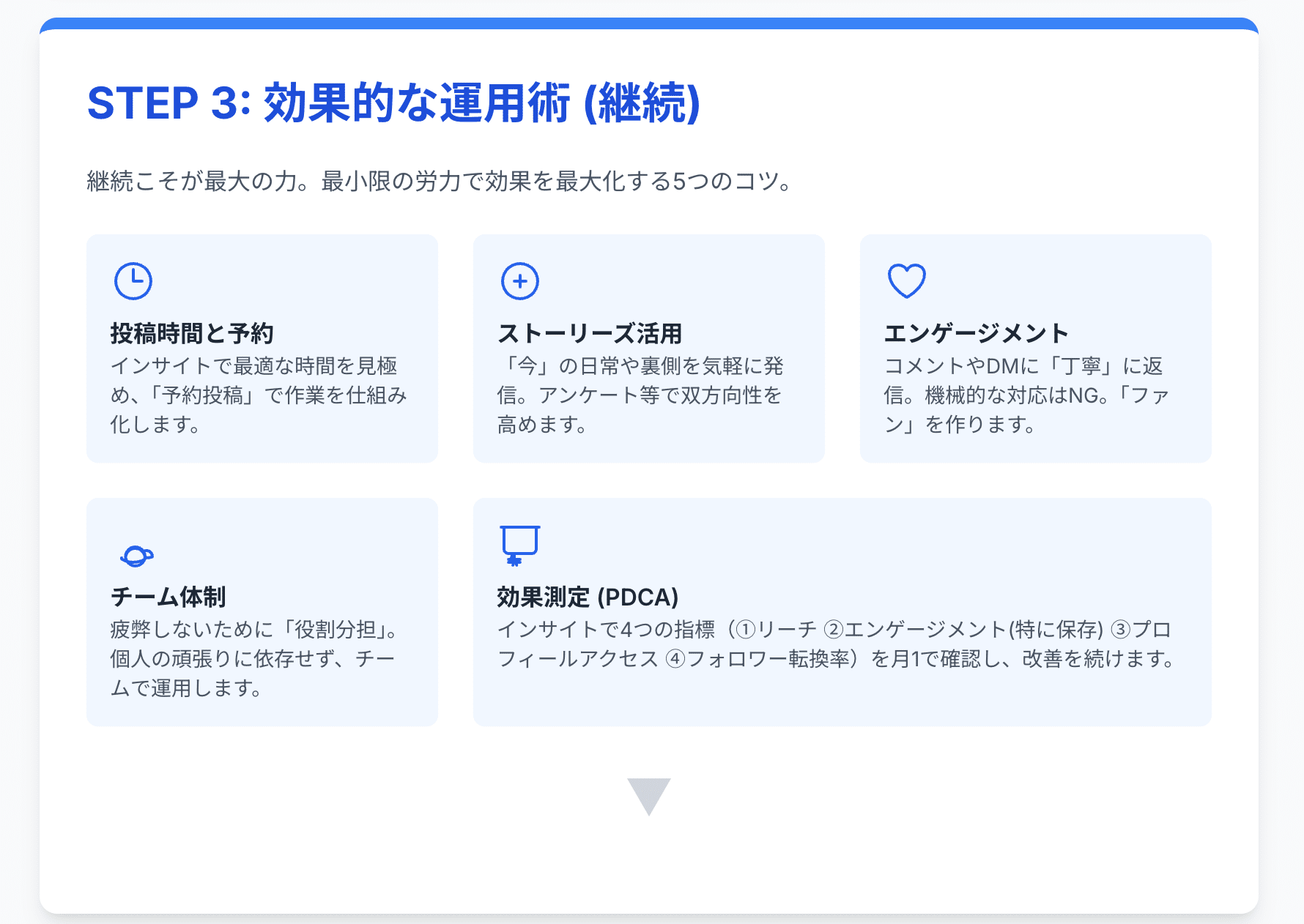 このように、投稿作業を「仕組み化(スケジュール管理)」することで、日々の運用負担を劇的に軽減し、「継続」可能な体制を築くことができるのです。