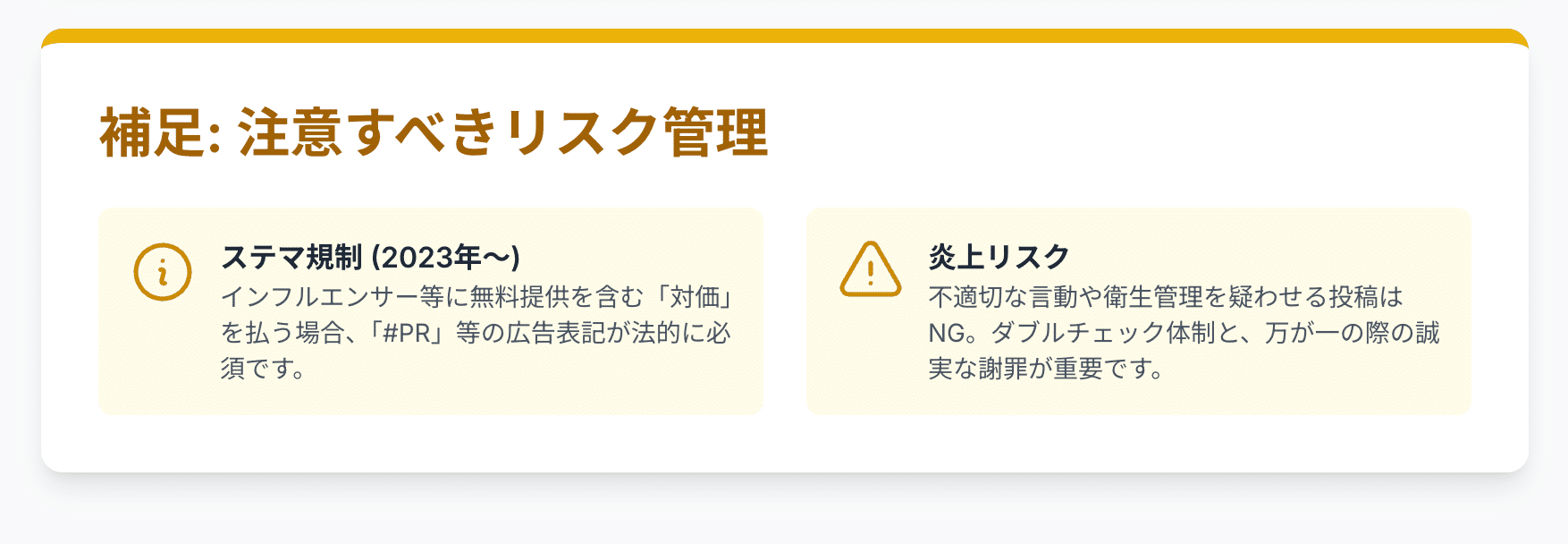 これらのリスクを正しく理解し、適切な管理体制(ガイドラインの策定やチェック体制)を敷くこともまた、現代の飲食店経営者にとって不可欠な「運用術」の一つなのです。