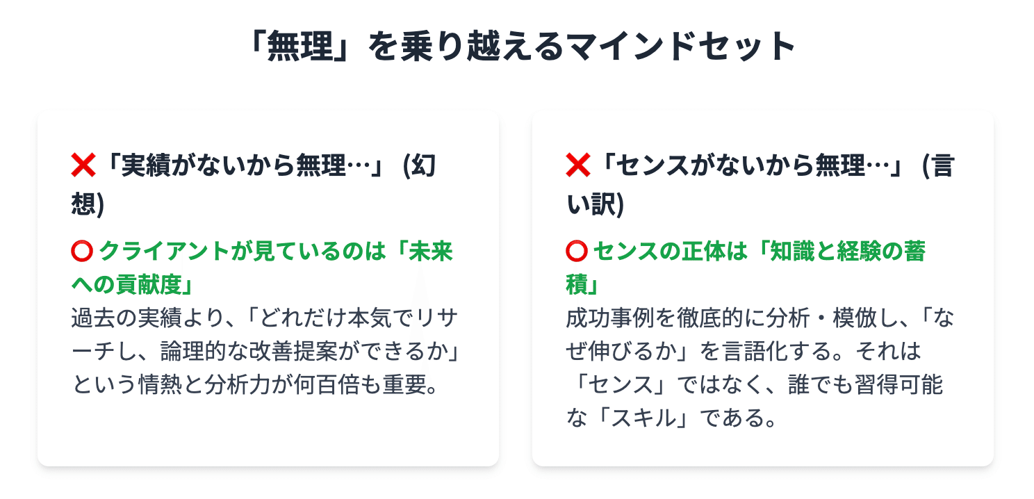 クライアントが求めているのは「過去の実績」ではなく、**「未来への貢献度」を測るための「情熱」と「リサーチ力」**なのです。