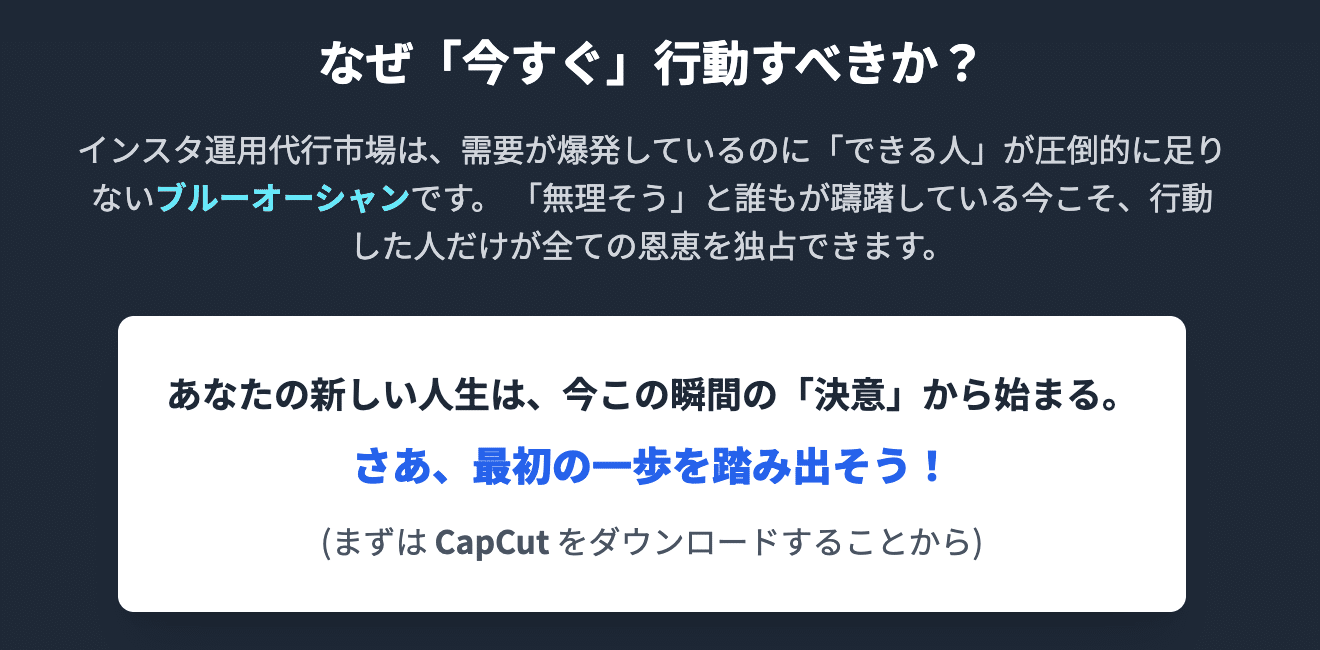 あなたが、「今、変わる」と決意し、不格好でも、みっともなくても、今日この場で、**最初の一歩(まずはCapCutをダウンロードすること)**を踏み出すことによってのみ、創り出されるものなのです。
