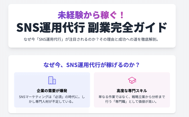 これから副業としてSNS運用代行を始めたいと考えるあなたが抱えるであろう「具体的な仕事内容は?」「未経験でも本当に大丈夫?」「どうやって案件を獲得するの?」「安定して稼ぐコツは?」といったあらゆる疑問や不安。